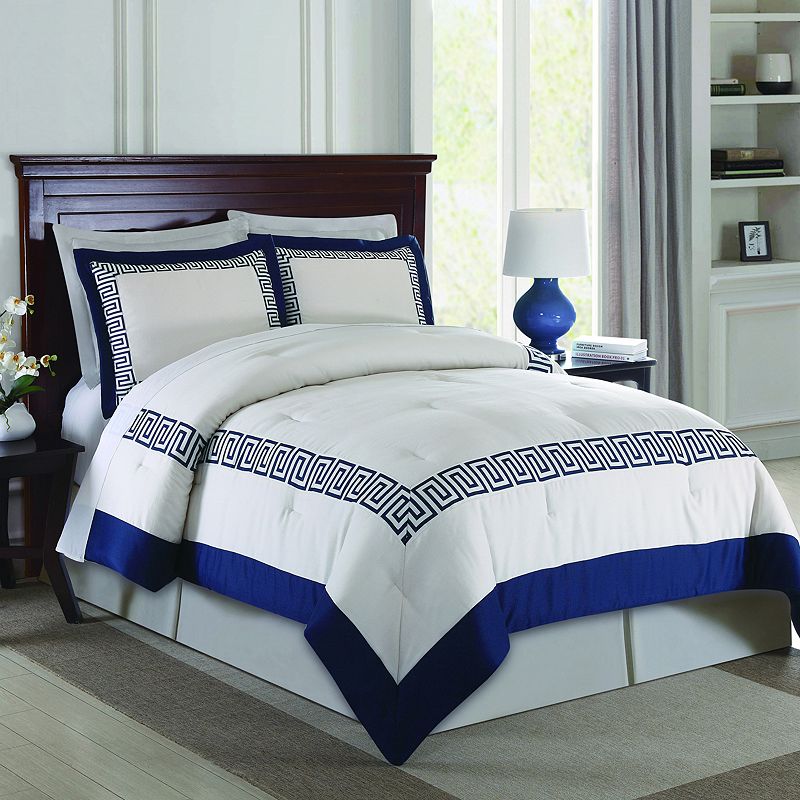 Features 8-piece set 143-thread count Colorblock design Pleated pillow details What's Included Queen comforter: 94 x 90 2 standard shams 2 Euro shams Bedskirt: 15 drop Oblong decorative pillow: 12 x 18 Square decorative pillow: 18 x 18 Construction &